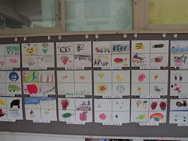1年生の廊下には,「すきなものいっぱい」で描いた,自分が好きなものの絵が掲示されています。