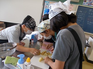 調理台や調理器具を慎重に扱って、ゆでたじゃがいもの堅さをたけぐしで確認していました。友達と協力して取り組んでいました。